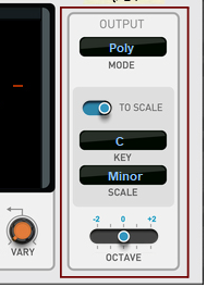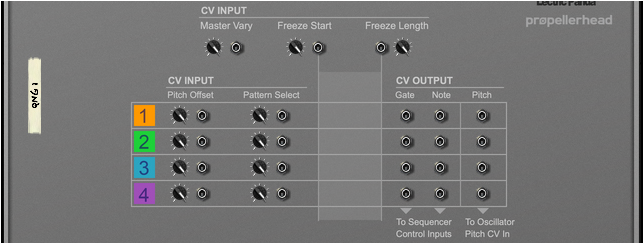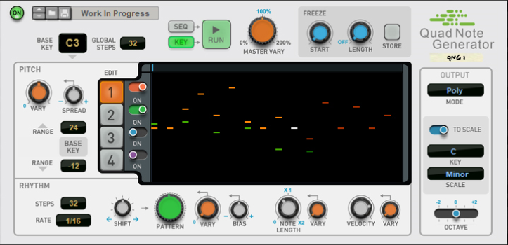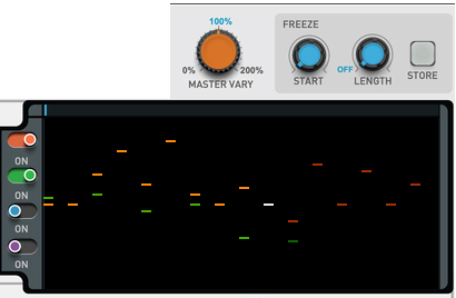 The Master Vary knob is a global control which scales all Vary parameter amounts of all active Note Lines, as defined by the “Pattern Vary”, “Pitch Vary”, “Note Length Vary” and “Velocity Vary” controls. Using the Master Vary control is a great way of going from static, monotone rhythm patterns to total chaos.