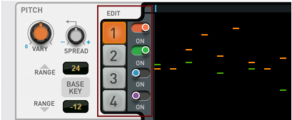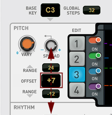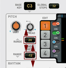 When set to 0 (12 o'clock position), any pitch variations from the Vary knob will result in totally random pitches within the set pitch range. Lowering the Spread setting will keep varied notes closer to the Base Key, while raising Spread will make the varied pitches more likely to be near the far ends of the pitch range. With Spread at 100% the pitch will vary between the Base Key, the lowest and the highest key in the set Pitch Range (see “Pitch Range”).