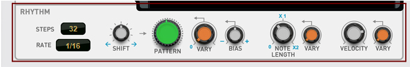 Range: 0-200%, where 0 is no pattern, pitch, note length or velocity variation at all, 100% is pattern, pitch, note length and velocity variations as set with the “Pattern Vary”, “Pitch Vary”, “Note Length Vary” and “Velocity Vary” controls for the respective Note Lines, and 200% is twice the pattern, pitch, note length and velocity variation amounts as set with the “Pattern Vary”, “Pitch Vary”, “Note Length Vary” and “Velocity Vary” controls for the respective Note Lines.