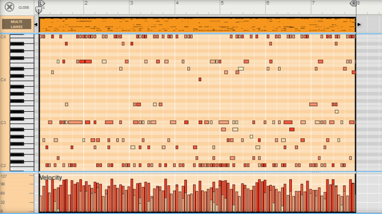 At zero, the pitch will be constant for all generated notes, according to the Base Key note. The higher the value the more randomized the pitch variation. You can set the total range of the pitch variation in the Pitch Range displays, see “Pitch Range”.