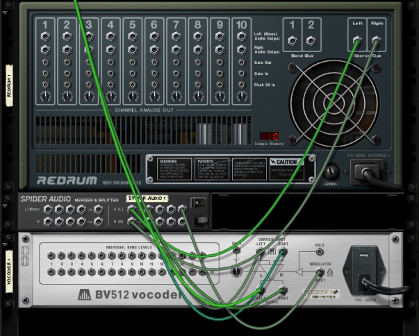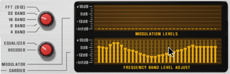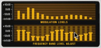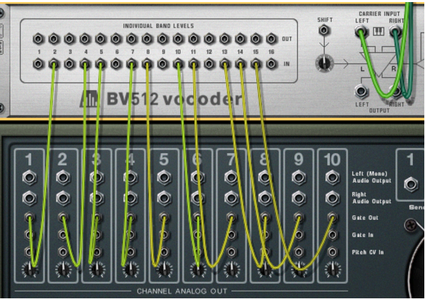 There are several interesting uses for the Individual band levels connectors: you can cross-patch frequency bands so that e.g. low frequencies in the modulator signal controls high frequency bands in the vocoder, you can extract CV signals for controlling synth parameters in other devices, you can base the vocoding on CV signals from other devices rather than on a modulator signal, etc. See “Using the individual band level connections” for details.
