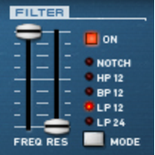 Note that the Filter Frequency parameter is usually controlled by the Filter Envelope (see “Filter Envelope”) as well. Changing the Filter Frequency with the Freq slider may therefore not produce the expected result.