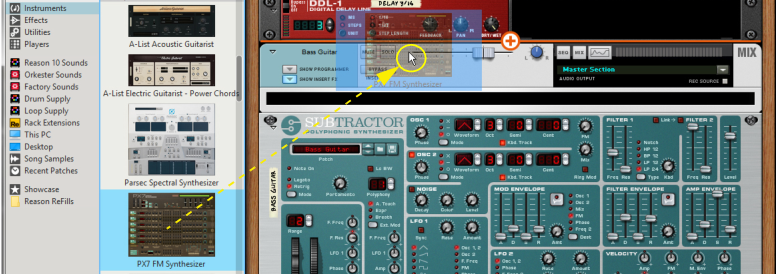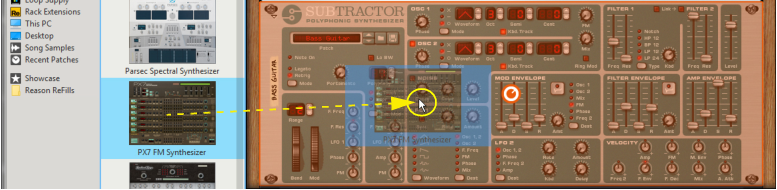 Adding a PX7 FM Synthesizer device by dragging from the Instruments device palette and dropping in the rack.