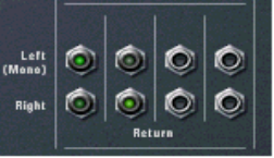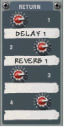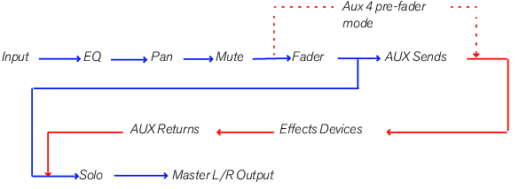 The four independent AUX Sends control the amount of channel signal that is to be sent to other devices - typically effect processors. The effect output is then normally returned to the Mixer via the AUX Return inputs (see “The Auxiliary Return Section”) where it is mixed with the dry (non-processed) signal. If you create an effect device when the Mixer is selected, the effect is auto-routed to the first available Send/Return connectors. You can then control the amount of effect that is to be applied to any device connected to a Mixer channel via the corresponding AUX Send knob. The AUX Send outputs are taken post channel fader, but you have the option of selecting Pre-fader mode for AUX Send 4 (by clicking the “P” button next to the send so that it lights up). In that mode, the send level is independent of the channel fader.