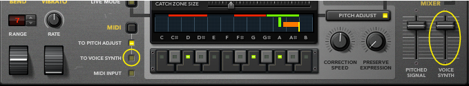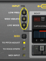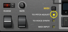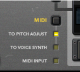 Routes incoming MIDI Note data to the Pitch Adjust section for manual control of pitch correction, see “Using manual pitch correction”. Pitch Bend and Vibrato (Mod Wheel) MIDI data will also be routed to the Pitch Adjust section.