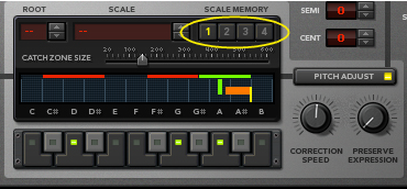 There are four Scale Memory slots in the Pitch Adjust section. The purpose of Scale Memories is to allow for automation of different Root Key, Scale and Catch Zone settings. A selected Scale Memory slot automatically stores which Root Key and Scale notes are active (see “Setting Root Key and Scale”), just like a Redrum stores what 16th note buttons are selected in a pattern. The Scale Memory slots also store Catch Zone settings (see “Setting Catch Zone Size”). By using automation of the Scale Memory slots from the Neptune sequencer track, you can easily switch characteristics throughout the song. The Scale Memory settings are automatically saved with the document when you save your Song.