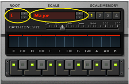 Set the Root key and Scale with the spin controls. You can also create your own custom scales by selecting individual notes in the Keyboard display. See “Setting Root Key and Scale” for more details on how to use these functions.