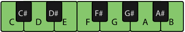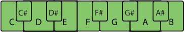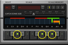 The Catch Zones are displayed as red horizontal boxes above each selected key on the virtual keyboard. As soon as a detected Input Pitch lies within a Catch Zone, the Catch Zone box above the corresponding Target Note switches to green. See “Setting Catch Zone Size”.