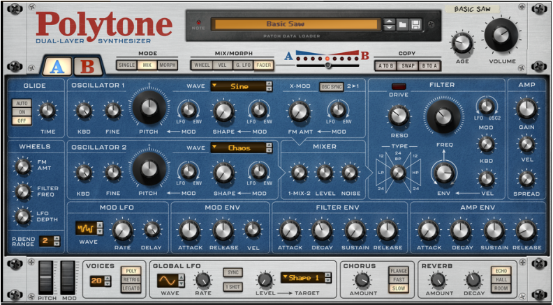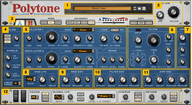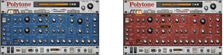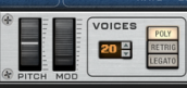 Select this if you want to play Polytone Dual-Layer Synthesizer polyphonically. The maximum number of voices is 20. The number of voices is set in the Voices control at the center right of the Polytone Dual-Layer Synthesizer panel, see “Voices”.