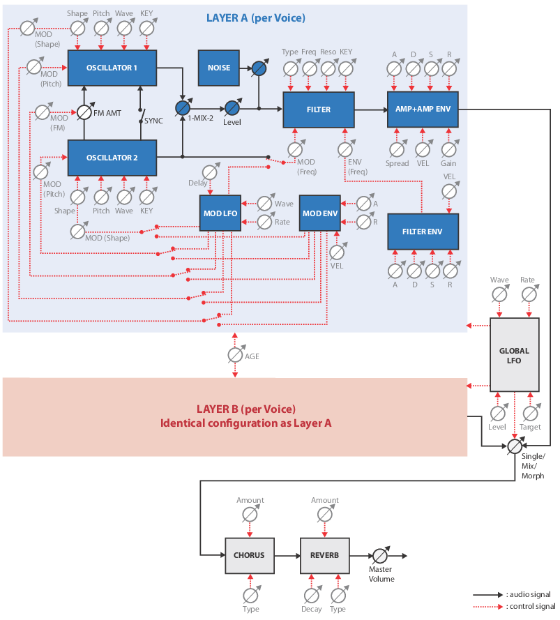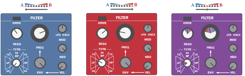 In Morph mode all the settings of the layer-specific parameters in each layer are morphed between, depending on the “Mix/Morph” setting. In practice, morphing means that the parameters continuously move between the values they have in the two layers.