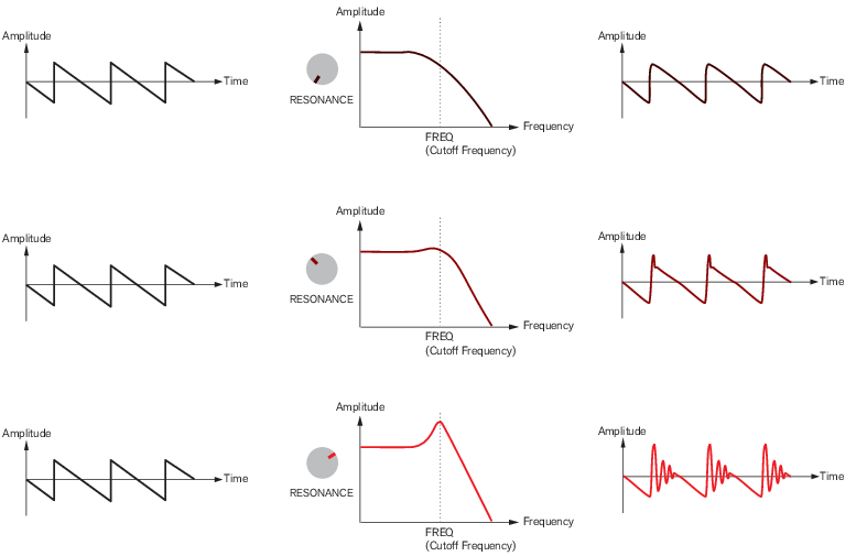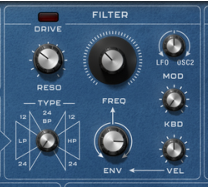 The Drive LED lights up when the signal in the Filter is overdriven (e.g. by a high “Level” and/or by a high “Reso” setting).