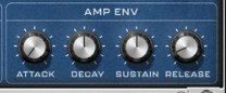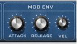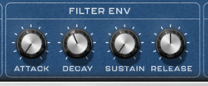 The Filter Envelope can be used for modulating the Filter cutoff frequency over time. You set the modulation amount with the “Env” knob in the Filter section. It features the standard Attack, Decay, Sustain and Release parameters of an ADSR envelope.