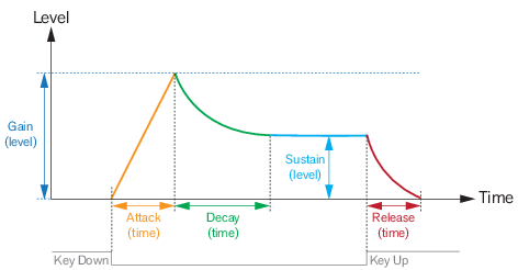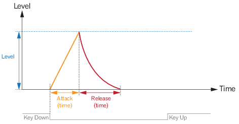 When you play a note on your keyboard, the envelope is triggered. This means it starts rising from zero to the value set with the “Gain” knob in the Amp section. How long this should take, depends on the Attack setting. If the Attack is set to “0”, the Gain level is reached instantly. If the Attack value is raised, it will take longer time before the Gain level is reached.