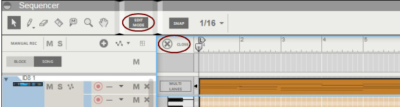 The Edit Mode shows the contents of a single lane at a time on the Edit Pane - unless you use the Multi Lanes function, described in “Multi Lanes editing”, where you can see the contents of multiple note lanes in a “ghosted” fashion underneath the currently open clip. On instrument tracks, only one note lane can have edit focus at a time.