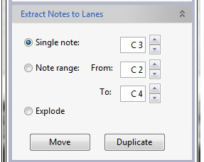 The “Extract Notes to Lanes” function on the Sequencer Tools tab in the Tool Window is used for moving or duplicating user-defined notes of a certain pitch, or notes within a defined pitch range, to a new note clip on a new, additional note lane. This function is very useful if you, for example, have recorded a drum track, with all notes in the same clip, and then want to extract individual drum sounds (note pitches in this case) to separate lanes to be able to edit them more easily - or to apply ReGroove channels (see “The ReGroove Mixer”).