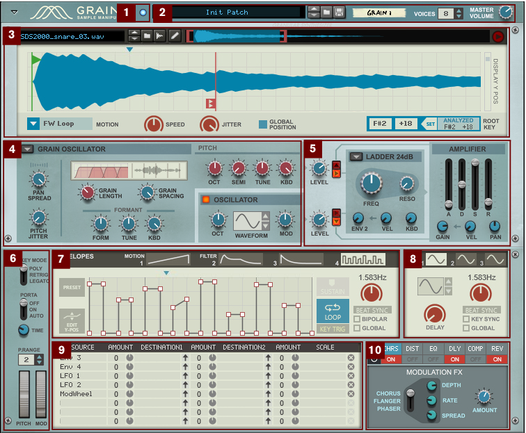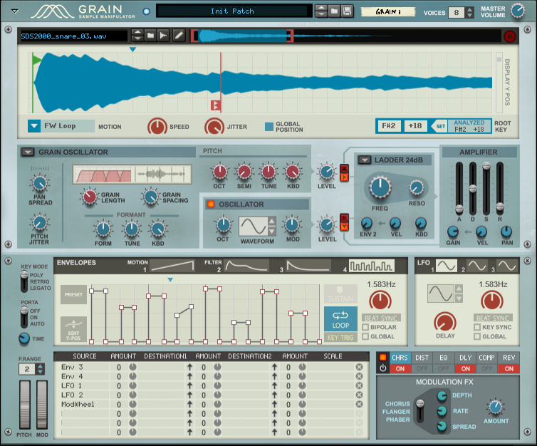 The Mod wheel can be used for controlling almost any parameter in Grain. Use the Mod wheel as a Source parameter in the Modulation Bus section and then route to the desired Destination parameter(s), see “The Modulation Bus section”.