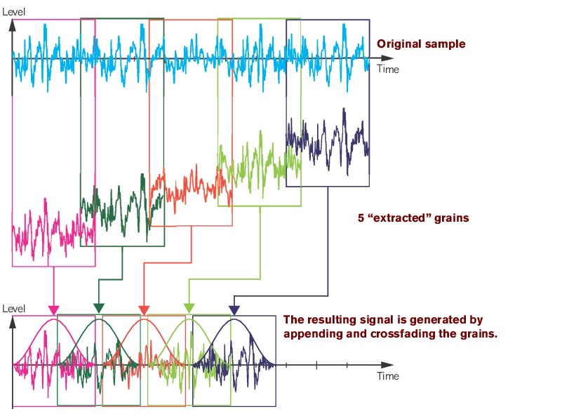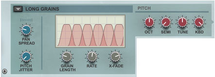 The Long Grains playback algorithm plays back fairly long grains of the original sample. This means that it’s the original pitch of the sound (Root Key) that affects the pitch, along with the Pitch settings (see “Pitch controls”).