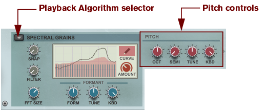 In the Spectral Grains playback algorithm (see “Spectral Grains”), the Pitch controls have no effect if Snap and Filter are set to 0%. To get full effect of the Pitch controls, set Snap or Filter to 100%.