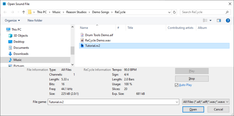 REX2 is the native file format of ReCycle. Saving a file in this format will significantly reduce the size of the file. This is achieved by applying a compression algorithm to the file when saved. The compression is “non-lossy” meaning that it does not compromise the audio quality in any way. How much the file will be compressed compared to the original size depends on the complexity of the audio and other factors. When you open a REX2 file, the file information in the Open dialog will tell you how much the size has been reduced, expressed as a ratio (see “File Information”).
